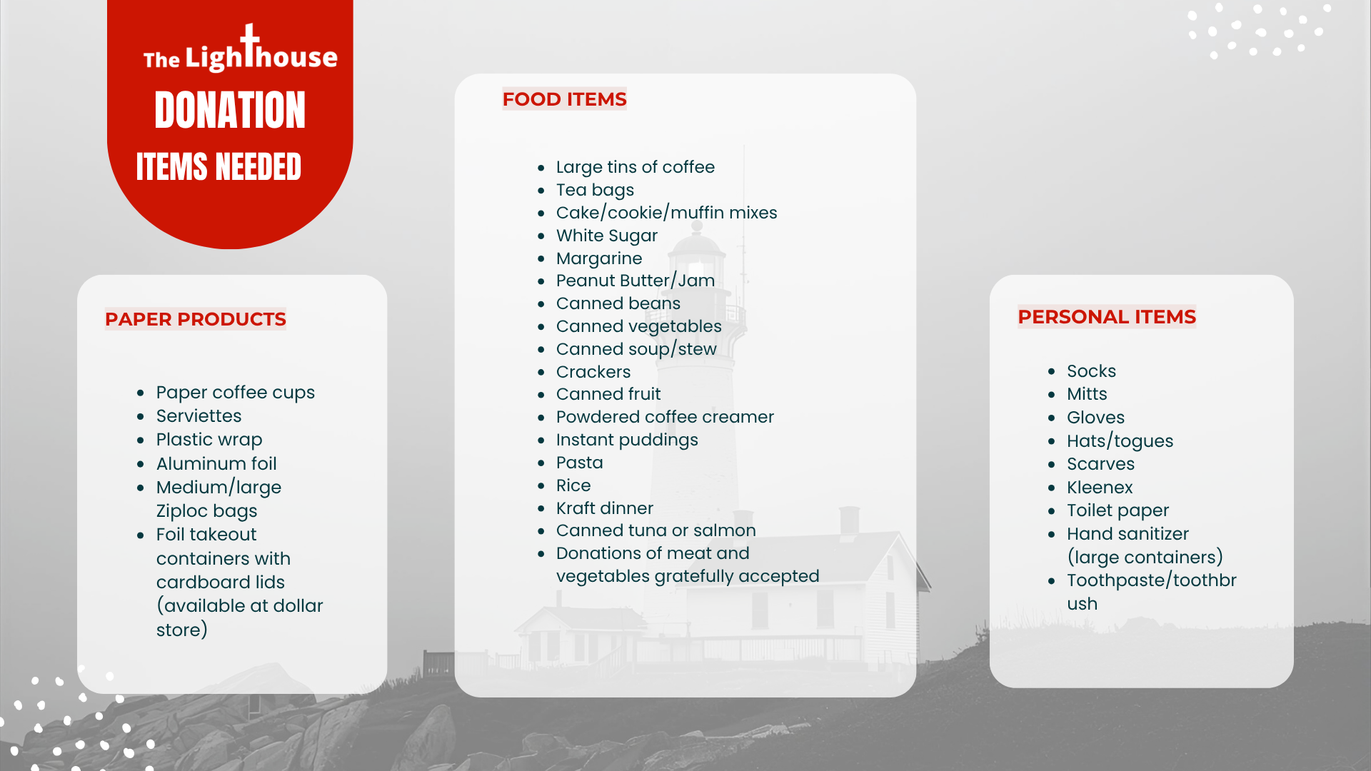 The Lighthouse is supported by donations from other local churches and community organizations. Many also come and volunteer with their time or donations of food. There are three ways you can get involved: volunteer with us, donate financially, or donate items.
